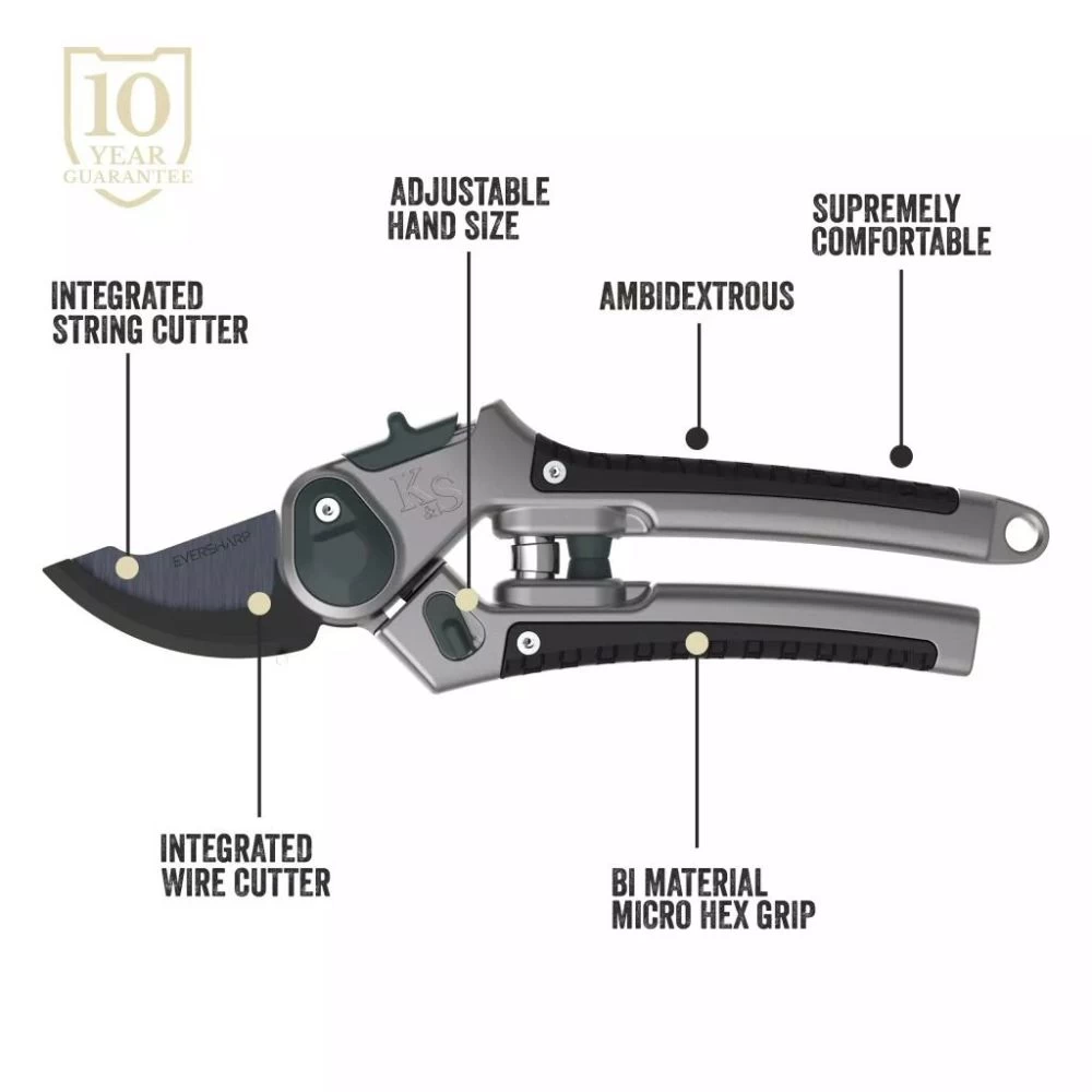 Eversharp All Purpose Secateurs are the perfect tool for precise and effortless pruning. With its unique aerospace coated technology, the carbon steel blade has been sharpened to twice the sharpness of any other blade on the market. The superior chassis, with its bi-material micro hex grip, is designed for long-lasting use. These secateurs are suitable for both left and right-handed users, with an adjustable hand size to provide maximum comfort.